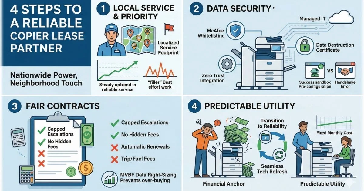 Four-step guide to a Reliable Copier Lease in Dallas, covering local service footprints, Data Security, Fair Contracts, and Predictable Utility.